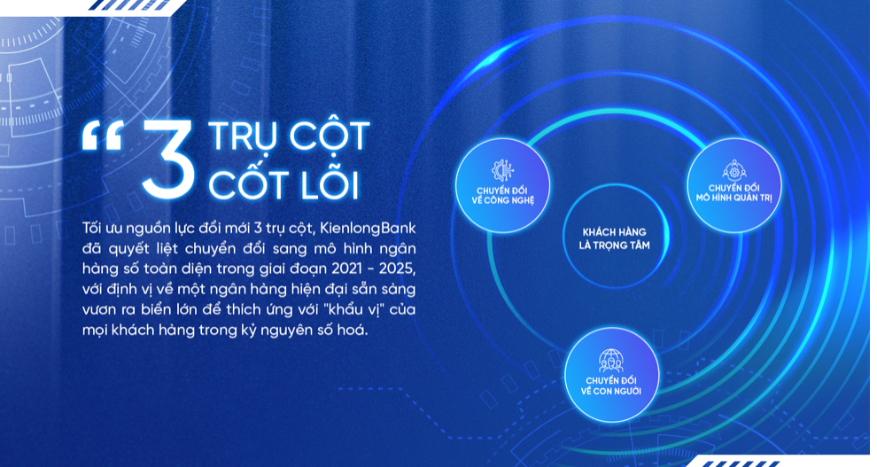 Việc đầu tư có chiều sâu, thay đổi về chất với trọng tâm hướng tới 3 trụ cột phát triển: Chuyển đổi về công nghệ; Chuyển đổi về mô hình quản trị; Chuyển đổi về con người là định hướng được vạch rõ trong Chiến lược phát triển đến năm 2025 của KienlongBank. Theo đó, Ngân hàng sẽ tiên phong ứng dụng công nghệ hiện đại trong quản trị điều hành và cung cấp dịch vụ; thực hiện toàn bộ dịch vụ ngân hàng trên nền tảng số; kiến trúc công nghệ mở trong kỷ nguyên 4.0.