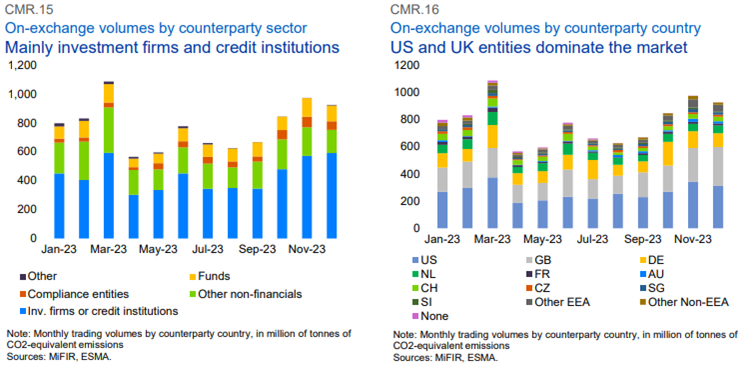 Các tác nhân chính trên thị trường thứ cấp EUA là các công ty đầu tư và tổ chức tín dụng, tham gia vào 56% (5,2 tỷ tCO2 hoặc 408 tỷ EUR) tổng khối lượng được giao dịch. Bên cạnh đó, nhất quán với báo cáo ESMA 2022, giao dịch EUA chủ yếu tập trung trong các tổ chức có trụ sở tại Hoa Kỳ (chiếm 34% khối lượng), tiếp theo là Vương quốc Anh (24%), Đức (14%) và Hà Lan (8%).