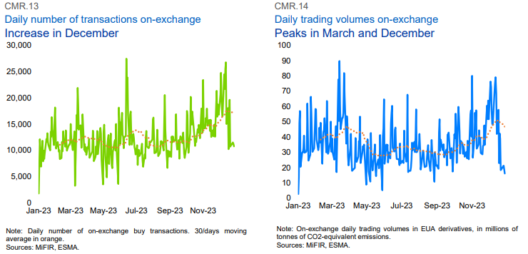 Nhìn chung, giao dịch các sản phẩm phái sinh EUA trong năm 2023 ổn định, không có biến động lớn nào. Tuy nhiên, số lượng giao dịch hàng ngày (CMR.13) cho thấy có ba giai đoạn chính mà lượng hoạt động gia tăng. Một là vào tháng 6, có thể liên quan đến việc Ủy ban Châu Âu công bố Gói tài chính xanh. Hai giai đoạn còn lại là vào tháng 3 và tháng 12, khi các hợp đồng tương lai thanh khoản cao nhất hết hạn. Hoạt động giao dịch gia tăng cũng được phản ánh qua khối lượng tCO2 lớn hơn và giá trị tiền tệ được trao đổi.
