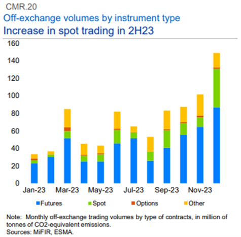 Giao dịch hợp đồng giao ngay đã thúc đẩy hoạt động giao dịch OTC tăng vào tháng 12 (CMR.20), với 44 triệu tấn CO2 được trao đổi so với mức trung bình hàng tháng là 9,5 triệu tấn CO2 trong phần còn lại của năm. Một lời giải thích khả thi là các tổ chức tuân thủ có lượng khí thải thấp và/hoặc có được phần lớn hạn mức của họ thông qua phân bổ miễn phí có xu hướng mua hạn mức giao ngay để bù đắp cho lượng khí thải thiếu hụt, thường là gần ngày hết hạn của hợp đồng phái sinh EUA.