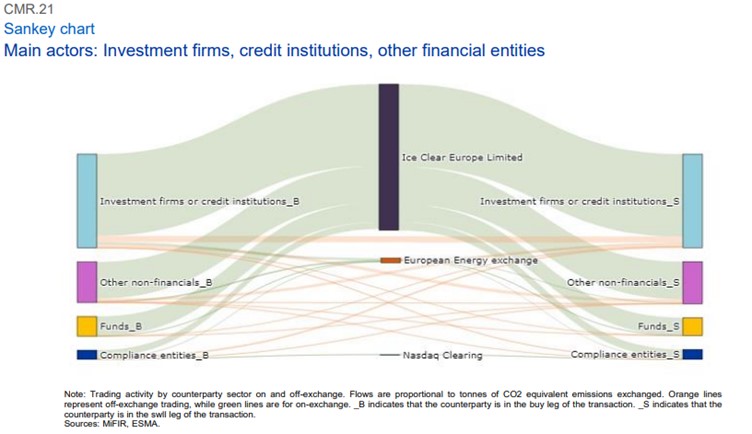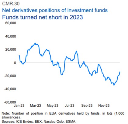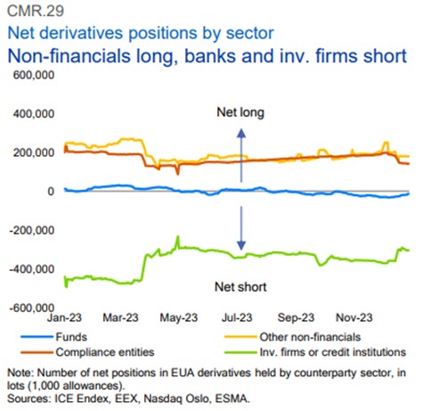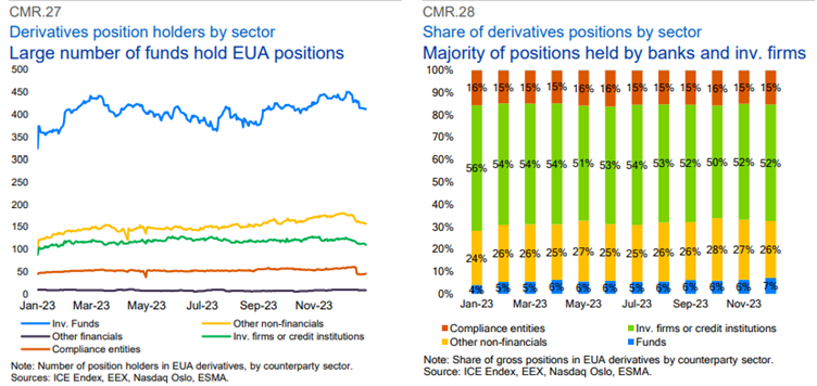 Thị trường phái sinh đóng vai trò quan trọng trong Hệ thống Thương mại Khí thải của EU (EU ETS) bằng cách tạo điều kiện cho các tổ chức tuân thủ mua tín chỉ phát thải EUAs từ các tổ chức trung gian tài chính. Các quỹ đầu tư thường theo sát diễn biến giá của EUAs và ngày càng gia tăng vị thế bán ròng (net short) trong năm 2023 khi giá tín chỉ giảm (CMR.30). Trong năm 2023, trung bình có 406 quỹ đầu tư nắm giữ vị thế hàng ngày, phù hợp với báo cáo năm 2022 của ESMA. Con số này được so sánh với 206 tổ chức tuân thủ và các tổ chức phi tài chính khác, cùng với 118 công ty đầu tư và ngân hàng (CMR.27).