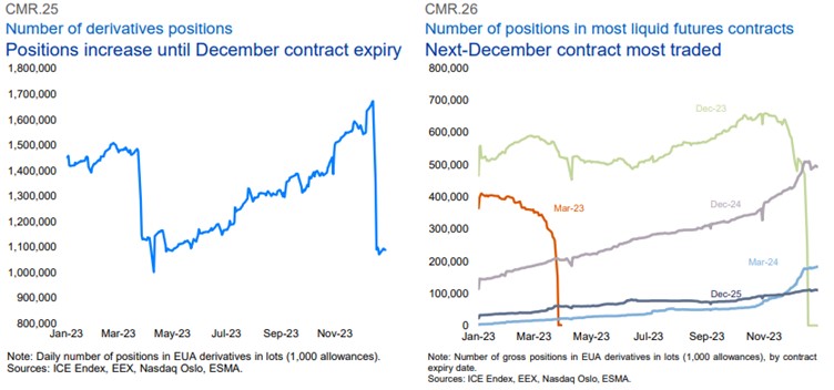 Số lượng vị thế thường đạt đỉnh vào giữa tháng 12 theo hoạt động giao dịch (xem phần trước) khi hợp đồng tương lai được giao dịch nhiều nhất ('next-Dec') hết hạn. Năm 2023, số lượng vị thế EUA đạt đỉnh ở mức 1,7 triệu vào ngày 15 tháng 12 (CMR.25), bao gồm 650.000 vị thế trong hợp đồng Dec-23. Một số vị thế được chuyển sang kỳ hạn mới khi hợp đồng tháng 12 đáo hạn, dẫn đến sự gia tăng số lượng vị thế trong các hợp đồng khác với ngày hết hạn muộn hơn (CMR.26). Tuy nhiên, tổng số vị thế đã giảm xuống mức thấp là 1,1 triệu vào cuối tháng 12 khi nhiều tổ chức nhận bàn giao các tín chỉ phát thải EUA.