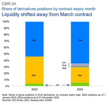 Cho đến nay, các hợp đồng tương lai tháng 3 thường được các đơn vị tuân thủ sử dụng như một 'khoản bổ sung'. Điều này cho phép họ mua thêm EUA giữa thời điểm hợp đồng tháng 12 đáo hạn và hạn nộp tín chỉ EUA vào tháng 4, nhằm phù hợp với lượng khí thải nhà kính của năm trước đó. Tuy nhiên, với việc hạn nộp tín chỉ chuyển sang tháng 9 từ năm 2024, một số thanh khoản dường như đang chuyển hướng: trong khi hợp đồng tháng 3/2023 chiếm 42% tổng số vị thế phái sinh vào ngày 1 tháng 1 năm 2023, hợp đồng tháng 3/2024 chỉ chiếm 24% vào ngày 29 tháng 12 năm 2023. Điều này dẫn đến sự tập trung lớn hơn vào hợp đồng tháng 12 tiếp theo (next-Dec) nhưng đồng thời cũng tạo ra các vị thế mới trong các hợp đồng sẽ đáo hạn vào tháng 6, tháng 8 và tháng 9 (CMR.24).