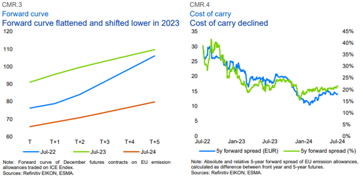 Hợp đồng tương lai thanh khoản cao nhất front-year hết hạn định kỳ vào tháng 12 được giao dịch gần với giá giao ngay EUA trong suốt năm 2023. Các hợp đồng tương lai có thời hạn dài hơn được giao dịch cao hơn giá giao ngay, như phản ánh trong đường cong lãi suất kỳ hạn dốc lên (CMR.3). Tuy nhiên, do lợi suất giảm vào năm 2023 (thành phần chính của chi phí lưu trữ (cost of carrying) hợp đồng tương lai EUA), đường cong lãi suất kỳ hạn cũng phẳng ra.