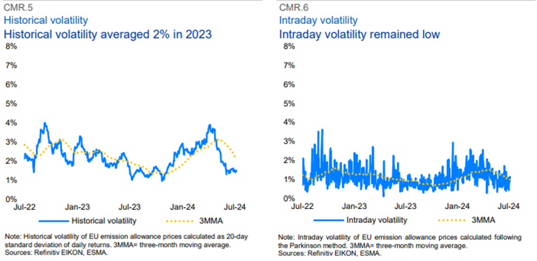 Giá trong hệ thống thương mại phát thải EU ETS đã giảm kể từ đầu năm 2023, trung bình ở mức 83 EUR/tấn CO₂ trong năm. Điều này phản ánh sự kết hợp của các yếu tố như nhu cầu tín chỉ EUA thấp hơn do hoạt động công nghiệp yếu, giá khí tự nhiên giảm, quá trình khử carbon của ngành năng lượng châu Âu, và nguồn cung tăng sau quyết định đấu giá thêm tín chỉ để tài trợ cho kế hoạch REPowerEU. Các thước đo về biến động giá nội ngày (intraday) và biến động lịch sử vẫn duy trì ở mức thấp trong suốt giai đoạn quan sát.