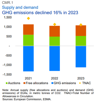 Năm 2023 1.127 triệu tấn CO2 đã được bù trừ theo EU ETS. Con số này đã giảm 16% so với cùng kỳ năm trước, chủ yếu do lượng khí nhà kính đã thẩm tra từ sản xuất điện giảm 24%. Bên cạnh đó, 560 triệu EUA đã được phân bổ miễn phí (giảm 1% so với 2022) và 523 triệu EUA được đấu giá (tăng 7% so với 2022), tổng mức tăng nguồn cung hàng năm là 3%. Do đó, nhu cầu vượt quá nguồn cung 43 triệu EUA và tổng số lượng hạn ngạch đang lưu hành (TNAC) giảm 2% xuống còn 1,1 tỷ. Trong khi đó, so với mức giảm của TNAC năm 2022, con số này là 22% (CMR.1).