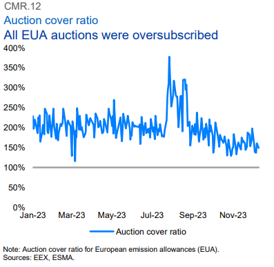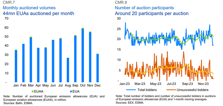 Tổng cộng có 223 cuộc đấu giá diễn ra trong suốt năm 2023 với số lượng trung bình hàng tháng là 43 triệu EUA (3,6 tỷ euro). Lượng hạn ngạch được đấu giá vào tháng 8 và tháng 12 giảm hơn so với mặt bằng chung, phản ánh thời gian nghỉ lễ và mùa hè thường ít hoạt động hơn (CMR.7).