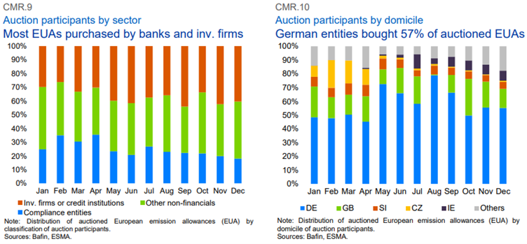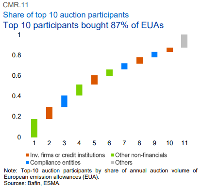 Báo cáo ESMA 2022 nhấn mạnh rằng hầu hết những người tham gia đấu giá đóng vai trò là người bán ròng các hạn ngạch phát thải trên thị trường thứ cấp và một số bên có thể mua EUA từ các cuộc đấu giá với tư cách là người môi giới thay mặt cho khách hàng của họ.