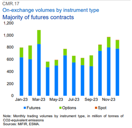 Năm 2023, tổng cộng 9,3 tỷ tấn khí thải tương đương CO2 (tCO2) trong các hợp đồng EUA đã được mua trên các điểm giao dịch của EU, trị giá 648 tỷ EUR. Hầu hết giao dịch tại địa điểm diễn ra thông qua các hợp đồng phái sinh tương lai (hoặc hợp đồng tương lai mini), chiếm 99% các giao dịch và 81% tổng khối lượng giao dịch (CMR.17). Chỉ có một số ít giao dịch là qua các hợp đồng quyền chọn (8.707), chiếm gần 18% tổng khối lượng giao dịch vào năm 2023 (1,7 tỷ tCO2 hoặc 0,9 tỷ EUR).