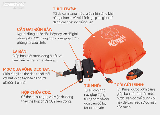 Thiết bị có thể tái sử dụng này chỉ nặng chưa đến 140 gram, và được thiết kế để không làm cản trở hoạt động của những người thích vận động dưới nước như chèo thuyền, lướt sóng, câu cá … Kingii đi kèm với chiếc còi và compass để giúp bạn báo hiệu và định hướng khi ở trên mặt nước.