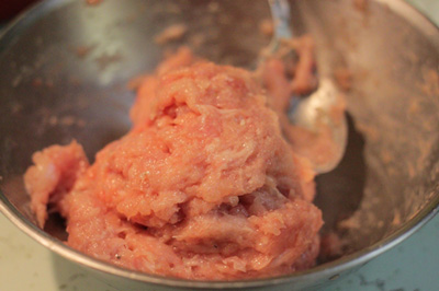 Thịt nạc băm đổ ra bát, trộn vào một thìa nhỏ muối, hai thìa nhỏ nước mắm, hạt tiêu, hành khô thái nhỏ, dùng thìa quết nhuyễn.