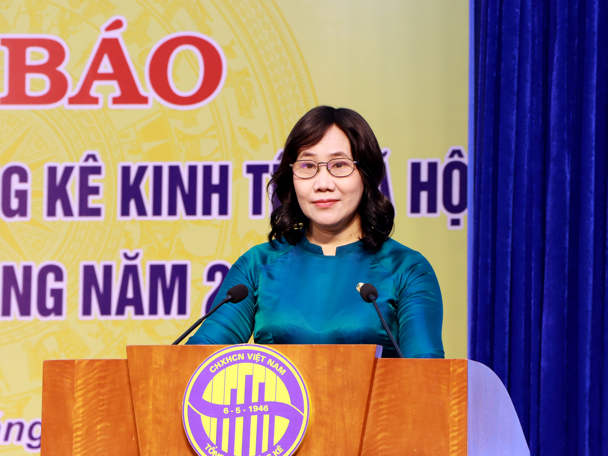 Cục trưởng Cục Thống kê Nguyễn Thị Hương chủ trì một buổi họp báo công bố số liệu thống kê kinh tế xã hội