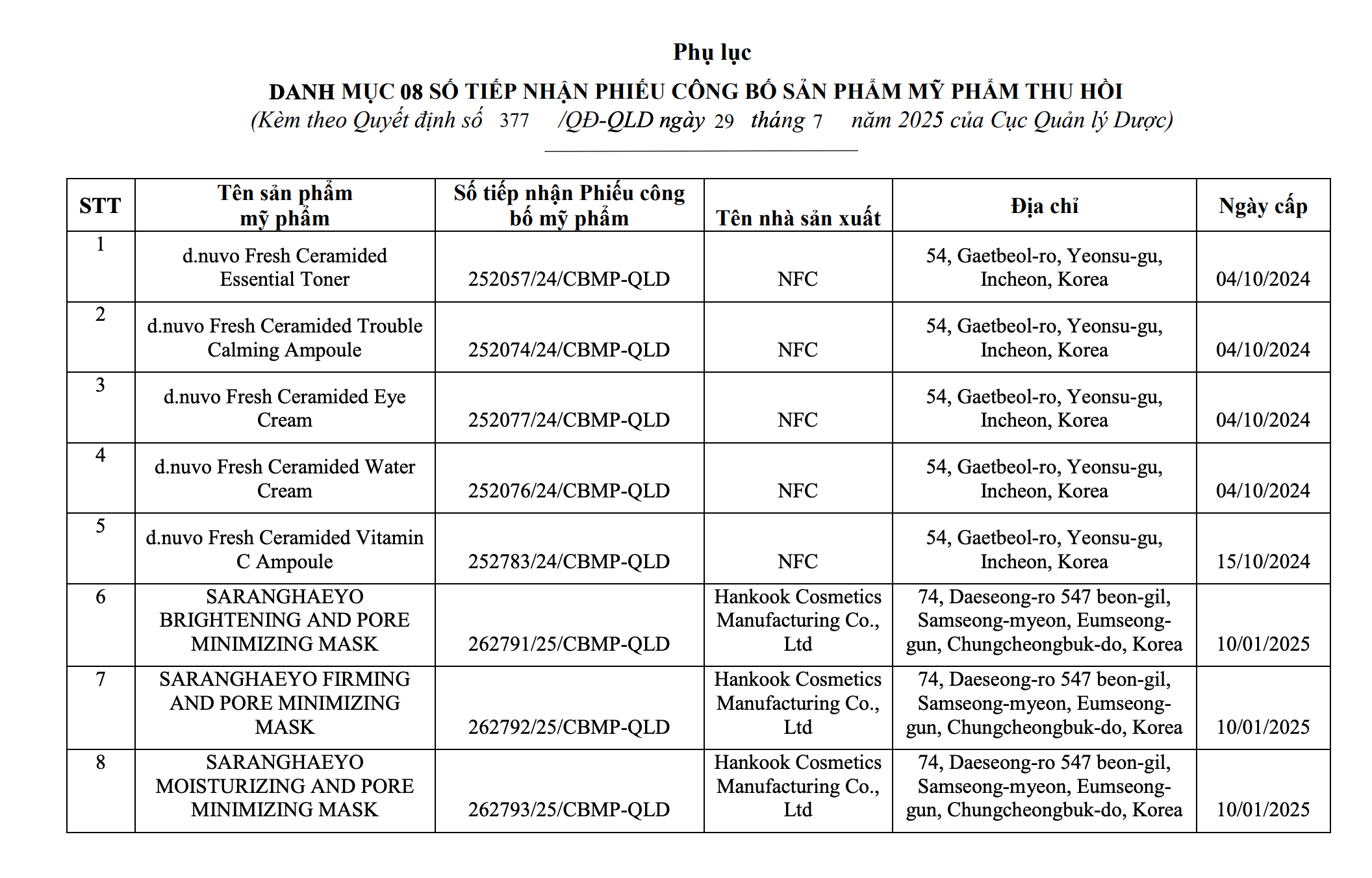 Ngày 29/7/2025, Cục Quản lý Dược (Bộ Y tế) ban hành Quyết định số 377/QĐ-QLD về việc thu hồi số tiếp nhận Phiếu công bố sản phẩm mỹ phẩm đối với 8 loại mỹ phẩm nhập khẩu từ Hàn Quốc do Công ty TNHH Aroya Skincare chịu trách nhiệm đưa ra thị trường.