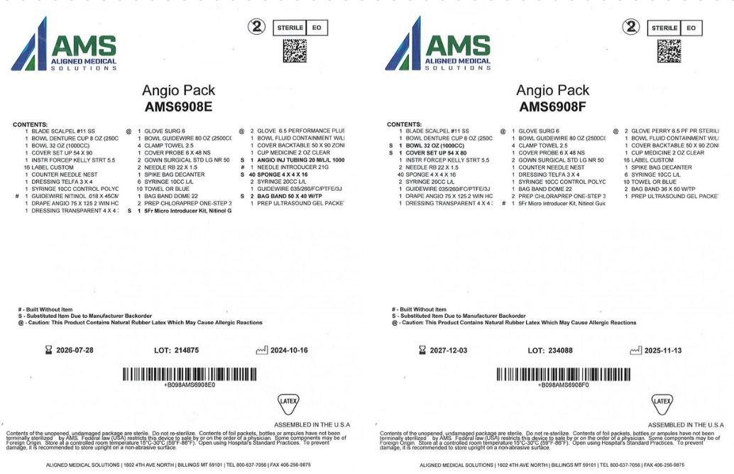 Theo Cục Quản lý Thực phẩm và Dược phẩm Hoa Kỳ (FDA), Công ty Aligned Medical Solutions đã chủ động thu hồi hai bộ kit gồm AMS6908E Angio Pack và AMS6908F Angio Pack. Các sản phẩm này có chứa xi lanh Medline Namic Angiographic Rotating Adapter (RA) 10cc – bộ phận được xác định tiềm ẩn nguy cơ mất an toàn trong quá trình sử dụng.