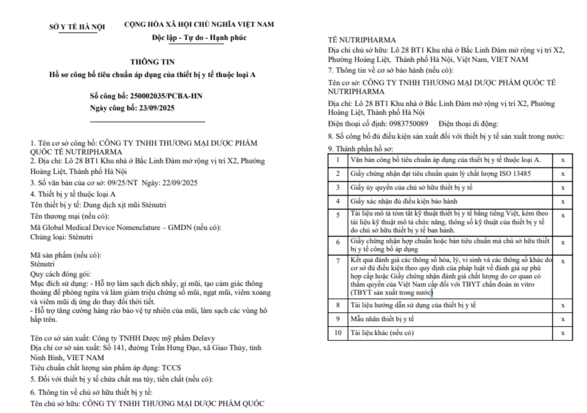 Dung dịch xịt mũi Sténutri do Công ty TNHH Thương mại Dược phẩm Quốc tế Nutripharma (địa chỉ: lô 28 BT1, khu nhà ở Bắc Linh Đàm mở rộng, phường Hoàng Liệt, quận Hoàng Mai, Hà Nội) phân phối, và được sản xuất tại Công ty TNHH Dược Mỹ phẩm Delavy (xã Giao Thủy, tỉnh Ninh Bình). Sản phẩm từng được cấp số công bố 250002035/PCBA-HN vào ngày 23/9/2025. Tuy nhiên, chỉ sau hơn hai tuần, kết quả hậu kiểm từ Sở Y tế Hà Nội cho thấy hồ sơ sản phẩm có nhiều điểm không đạt, buộc cơ quan chức năng phải thu hồi số công bố nói trên.