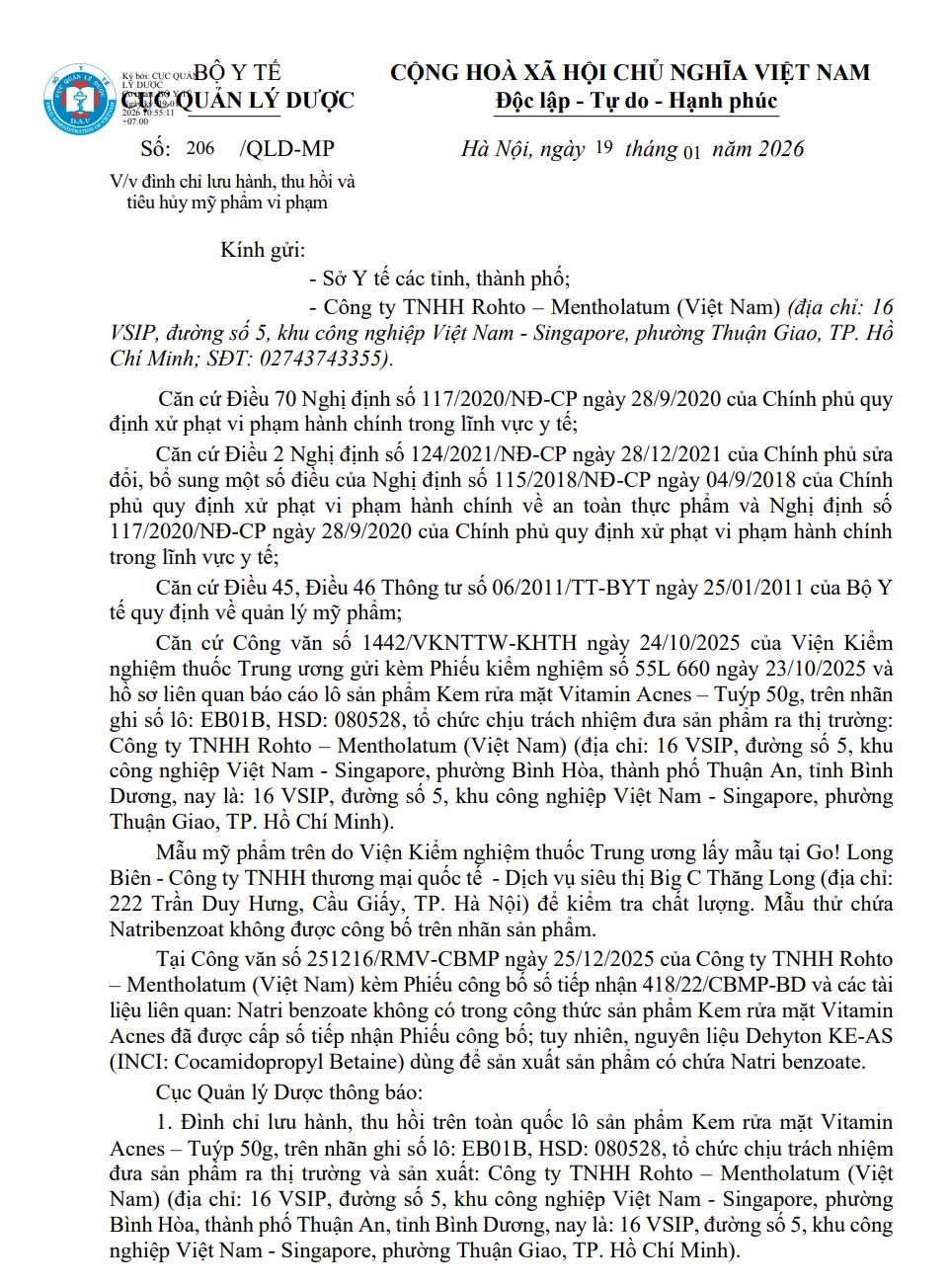 Theo Cục Quản lý Dược, kết luận xử lý được đưa ra trên cơ sở kết quả kiểm nghiệm của Viện Kiểm nghiệm thuốc Trung ương cùng các quy định pháp luật hiện hành về quản lý mỹ phẩm. Lô sản phẩm bị thu hồi là Kem rửa mặt Vitamin Acnes dạng tuýp 50g, số lô EB01B, hạn sử dụng đến ngày 08/5/2028, do Công ty TNHH Rohto – Mentholatum (Việt Nam) chịu trách nhiệm đưa ra thị trường.
