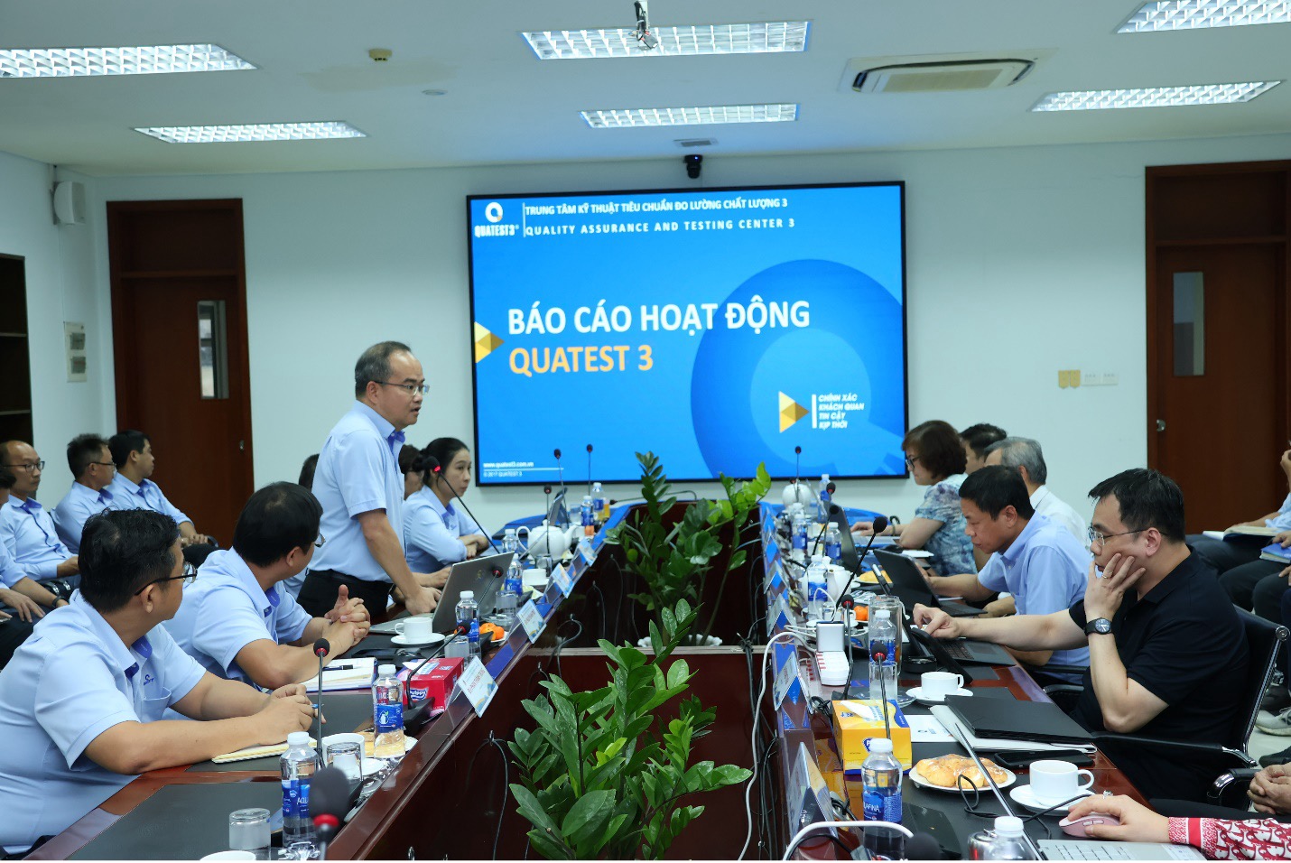 Ông Trần Quốc Dũng – Giám đốc QUATEST 3 báo cáo một số hoạt động trọng tâm của Trung tâm đến Thứ trưởng và lãnh đạo Ủy ban TĐC.