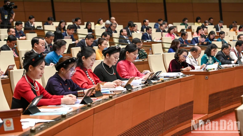 Các đại biểu Quốc hội tham dự phiên họp.Về tình hình thực hiện kế hoạch phát triển kinh tế-xã hội và ngân sách nhà nước những tháng đầu năm 2025, Thủ tướng cho biết, tốc độ tăng trưởng GDP quý I/2025 ước đạt 6,93%, cao nhất so với cùng kỳ giai đoạn 2020-2025; nhiều địa phương có mức tăng trưởng 2 con số.