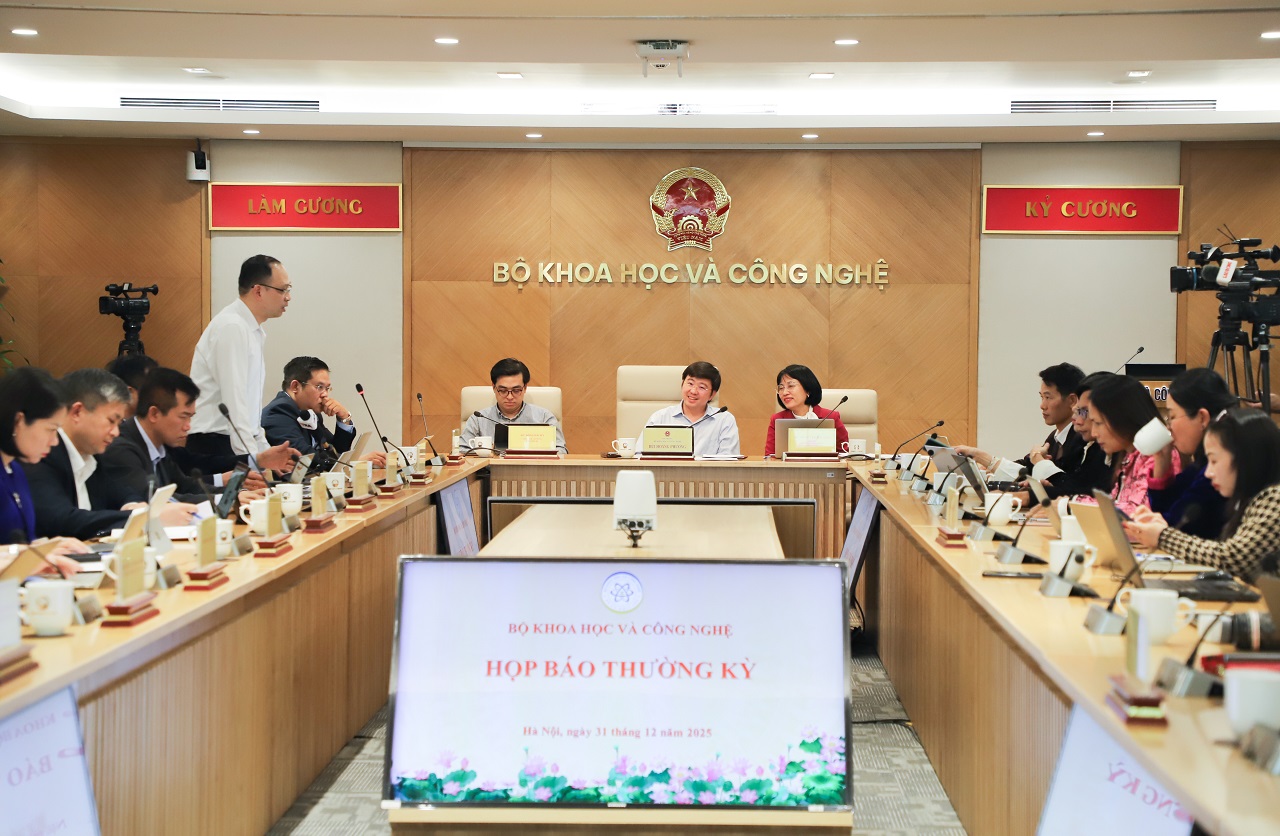 (VietQ.vn) - Ngày 31/12/2025, Bộ Khoa học và Công nghệ (KH&CN) tổ chức Họp báo thường kỳ tháng 12 nhằm cung cấp thông tin tới các cơ quan báo chí về kết quả hoạt động năm 2025 của ngành KH&CN và một số nhiệm vụ trọng tâm năm 2026. Thứ trưởng Bùi Hoàng Phương chủ trì buổi họp báo.