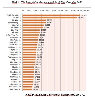 Theo báo cáo của Bộ Công Thương, doanh thu TMĐT của Việt Nam năm 2021 ước đạt 13,7 tỷ USD, tăng 16% so với năm 2020 và chiếm 6,5% tổng doanh thu bán lẻ cả nước. Số liệu của Tổng cục Thống kê cho thấy, năm 2022, TMĐT Việt Nam vẫn duy trì tốc độ tăng trưởng trên 25% và đạt quy mô trên 20 tỷ USD. Hà Nội và TP. Hồ Chí Minh là 2 thành phố dẫn đầu cả nước về tăng trưởng TMĐT. Theo báo cáo của Hiệp hội Thương mại điện tử Việt Nam, TP. Hồ Chí Minh tiếp tục dẫn đầu xếp hạng Chỉ số Thương mại điện tử Việt Nam 2022 với 90,6 điểm. Đứng thứ hai là Hà Nội với 85,9 điểm và kém TP. Hồ Chí Minh 4,7 điểm. Đứng thứ ba trong bảng xếp hạng là Đà Nẵng với 36,6 điểm và có khoảng cách rất xa so với TP. Hồ Chí Minh và Hà Nội. Điểm trung bình của chỉ số năm nay là 20,4 điểm. Song vẫn còn khoảng cách rất lớn giữa hai đầu cầu kinh tế là Hà Nội và TP. Hồ Chí Minh với các tỉnh thành còn lại. Điều này chứng tỏ tiềm năng phát triển TMĐT tại các tỉnh & nông thôn còn rất lớn (Hình 1).