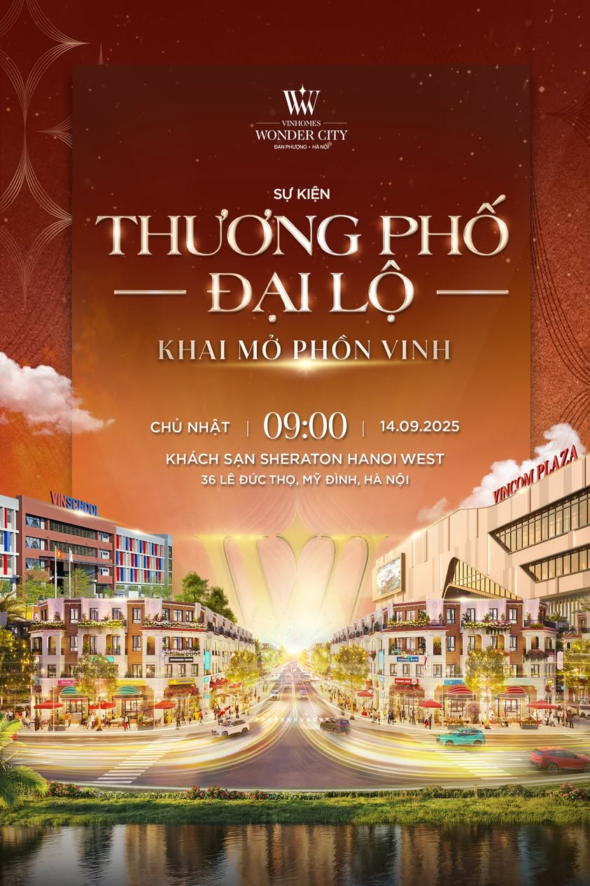 Sự kiện mở bán “Thương phố Đại lộ – Khai mở phồn vinh” sẽ diễn ra vào 09h00 Chủ nhật ngày 14.09.2025 tại khách sạn Sheraton Hanoi West, 36 Lê Đức Thọ, Mỹ Đình, Hà Nội, hứa hẹn thu hút sự quan tâm mạnh mẽ từ giới đầu tư và khách hàng tinh hoa phía Tây Hà Nội.