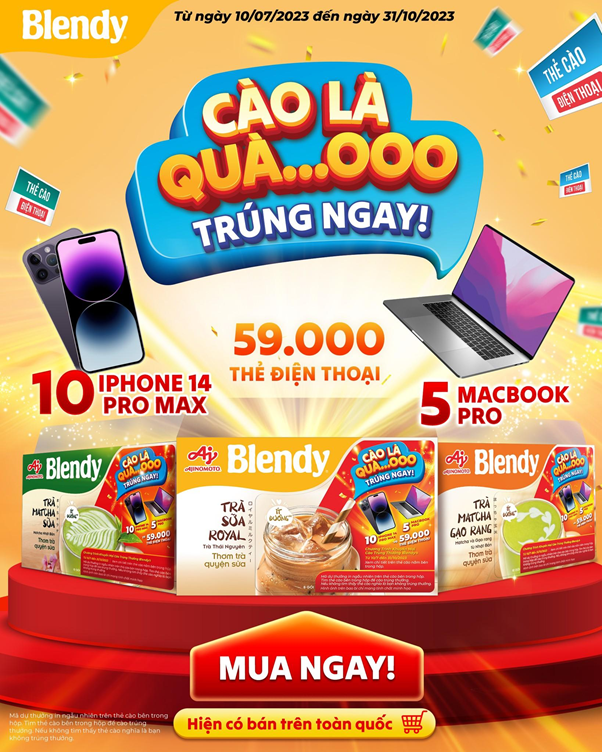Kể từ nay đến hết ngày 31/10/2023, khi mua các sản phẩm Blendy® Trà sữa Royal, Blendy® Trà Matcha Sữa và Blendy® Trà Matcha Gạo Rang của Công ty Ajinomoto Việt Nam, quý khách hàng sẽ có cơ hội trúng thưởng từ chương trình Blendy® - Cào là quà...ooo với những phần quà hấp dẫn, tổng giá trị giải thưởng hơn 1,1 tỷ đồng với hơn 60.000 sản phẩm. Cơ cấu giải thưởng bao gồm: