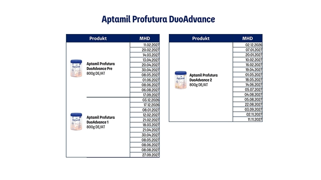 Trước đó, Aptamil cũng thu hồi một số sản phẩm tại thị trường Vương quốc Anh, sau đó mở rộng sang Đức và Áo. Giới chức Đức khuyến cáo phụ huynh kiểm tra sản phẩm dự trữ tại nhà theo mã vạch và hạn sử dụng; các sản phẩm thuộc diện thu hồi cần ngừng sử dụng và có thể mang trả lại nơi mua để được hoàn tiền. Nếu trẻ đã dùng sản phẩm và có dấu hiệu bất thường về sức khỏe, phụ huynh được khuyến nghị liên hệ cơ sở y tế.