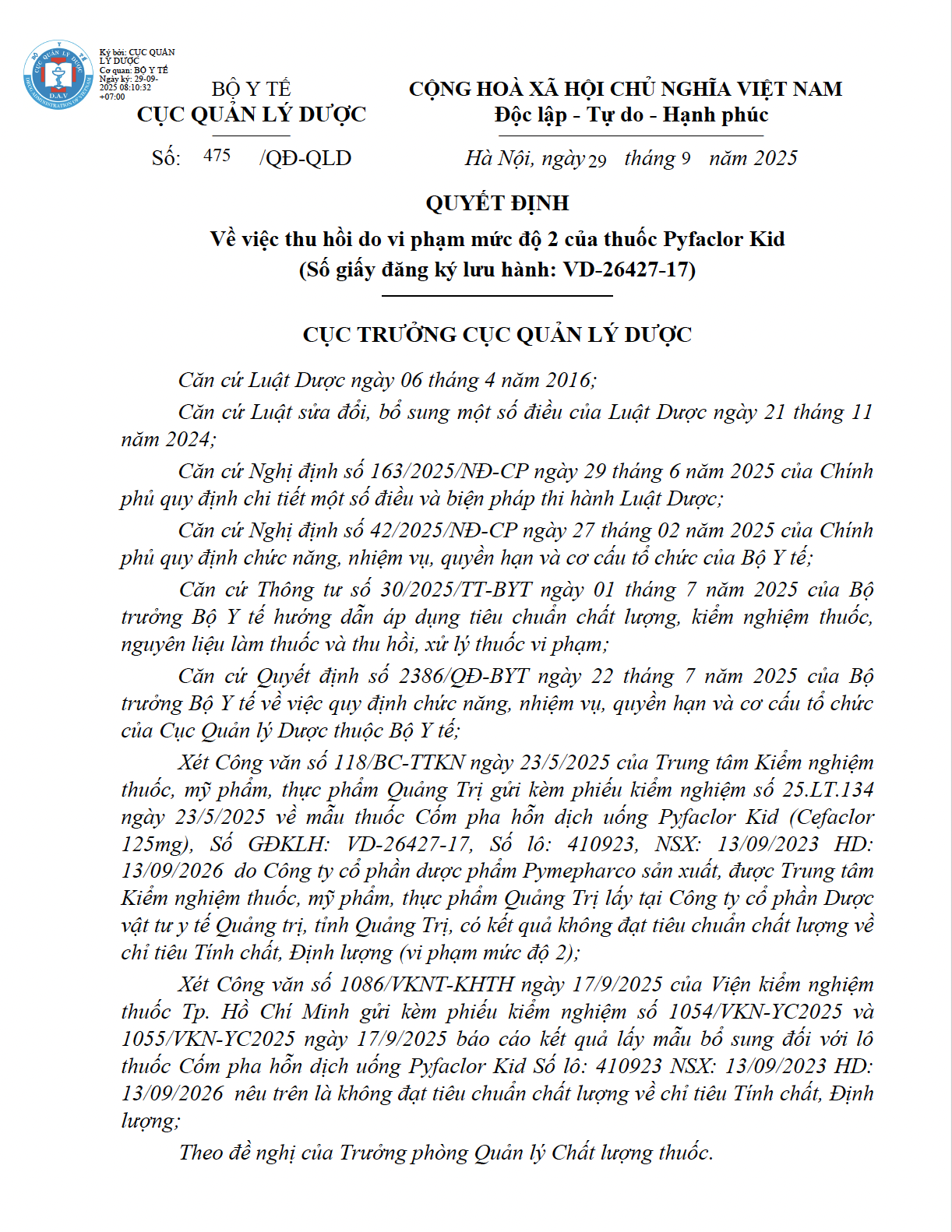 Ngày 29/9, Cục Quản lý Dược (Bộ Y tế) ban hành Quyết định thu hồi toàn quốc thuốc Cốm pha hỗn dịch uống Pyfaclor Kid (Cefaclor 125mg), Số đăng ký lưu hành: VD-26427-17, Số lô: 410923, NSX: 13/09/2023, HD: 13/09/2026 do Công ty cổ phần Dược phẩm Pymepharco (sau đây gọi tắt là Công ty Dược phẩm Pymepharco) sản xuất.