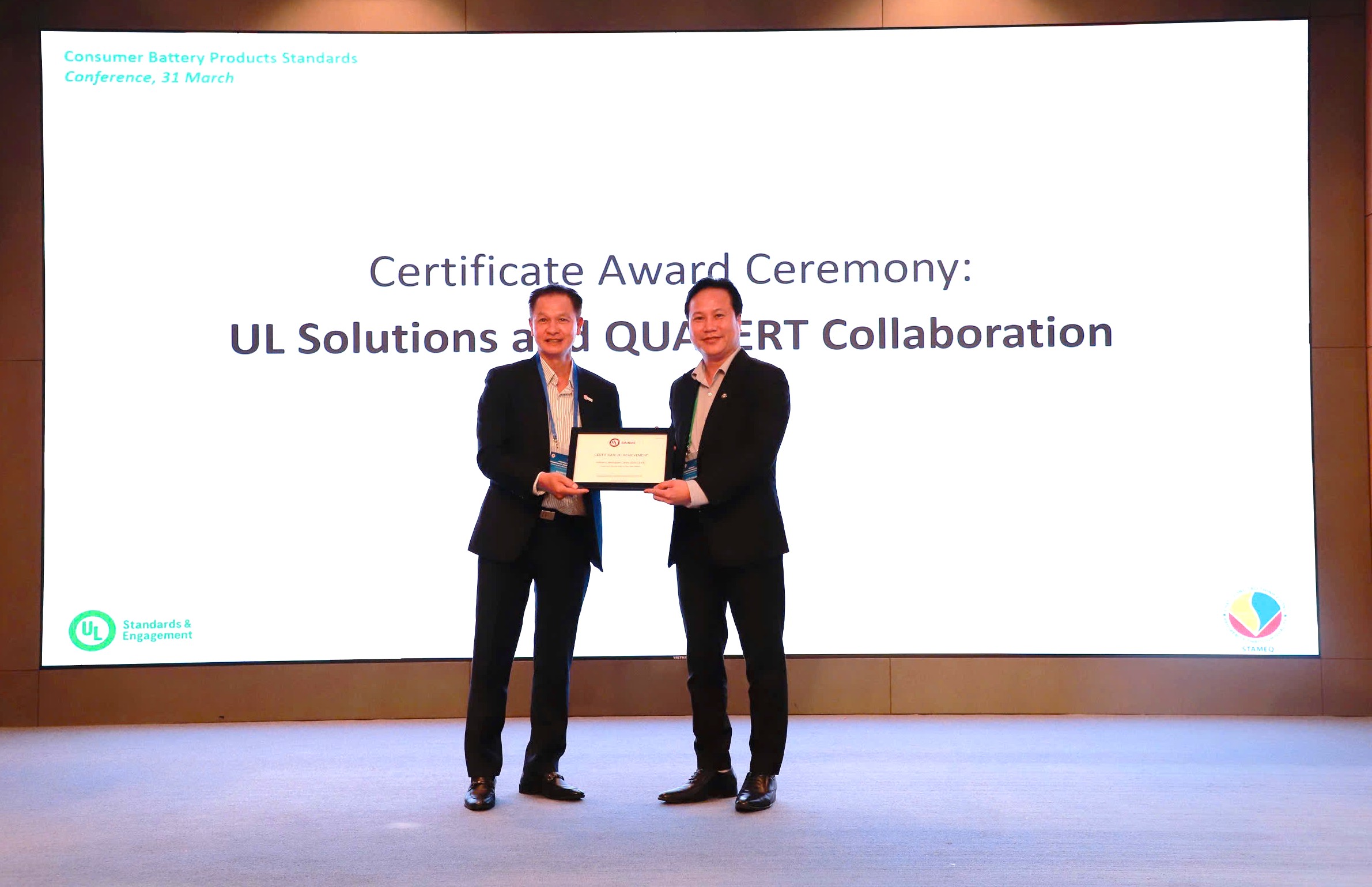 Trong khuôn khổ hội thảo đã diễn ra phần trao chứng nhận hợp tác giữa UL Solutions và Trung tâm Chứng nhận phù hợp (QUACERT), Uỷ ban TCĐLCL Quốc gia.