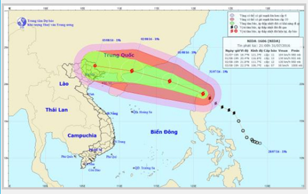 Hiện nay, dự báo bão Nida của các Trung tâm Dự báo bão quốc tế và Việt Nam cho xu hướng đổ bộ vào phía Nam Trung Quốc. Tuy nhiên, vẫn có khả năng bão di chuyển lệch về phía Nam (tương tự như bão số 1-Mirinae), hướng về phía Bắc Bộ và gây mưa lớn cho khu vực này, đặc biệt là khu vực trung du và vùng núi Bắc Bộ từ đêm 2/8.