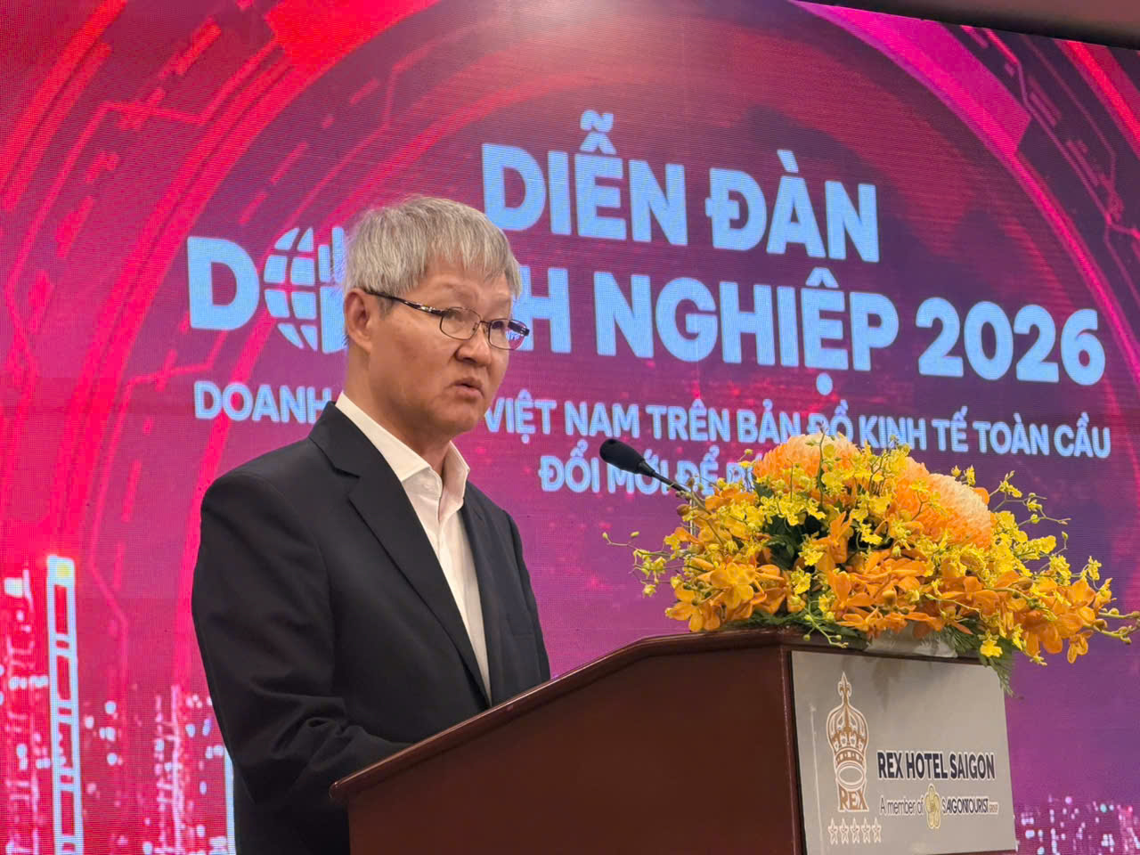 Ông Võ Tân Thành, Phó Chủ tịch Liên đoàn Thương mại và Công nghiệp Việt Nam (VCCI), phát biểu tại Diễn đàn. (Ảnh: Kim Thoa)
