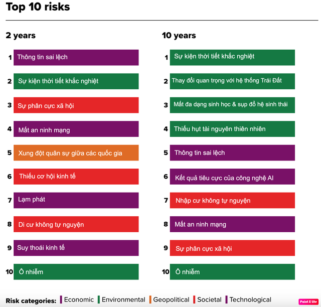 Trong 10 rủi ro lớn nhất được dự báo trong cả năm nay và thậm chí vào năm 2025, báo cáo của WEF xếp những thông tin gây hiểu lầm và tin giả do AI gây ra mối đe dọa lớn hơn cả các vấn đề biến đổi khí hậu, sự phân cực trong xã hội, mất an ninh mạng, xung đột vũ trang, thiếu cơ hội kinh tế, lạm phát, di cư miễn cưỡng, kinh tế suy giảm và ô nhiễm.