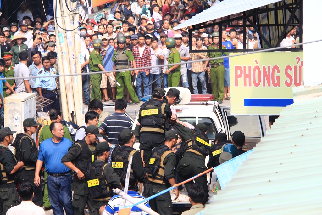 Tới 14h48, cảnh sát cơ động đạp cửa phòng xông vào căn phòng trọ. Một loạt súng vang lên. Căn phòng trọ đầy khói nghi là bị ném hơi cay. Người phụ nữ dáng vẻ mập mạp được đưa ra khỏi phòng. 5-6 cảnh sát trùm đầu Tuấn đưa anh ta lên xe đặc chủng rời khỏi hiện trường.