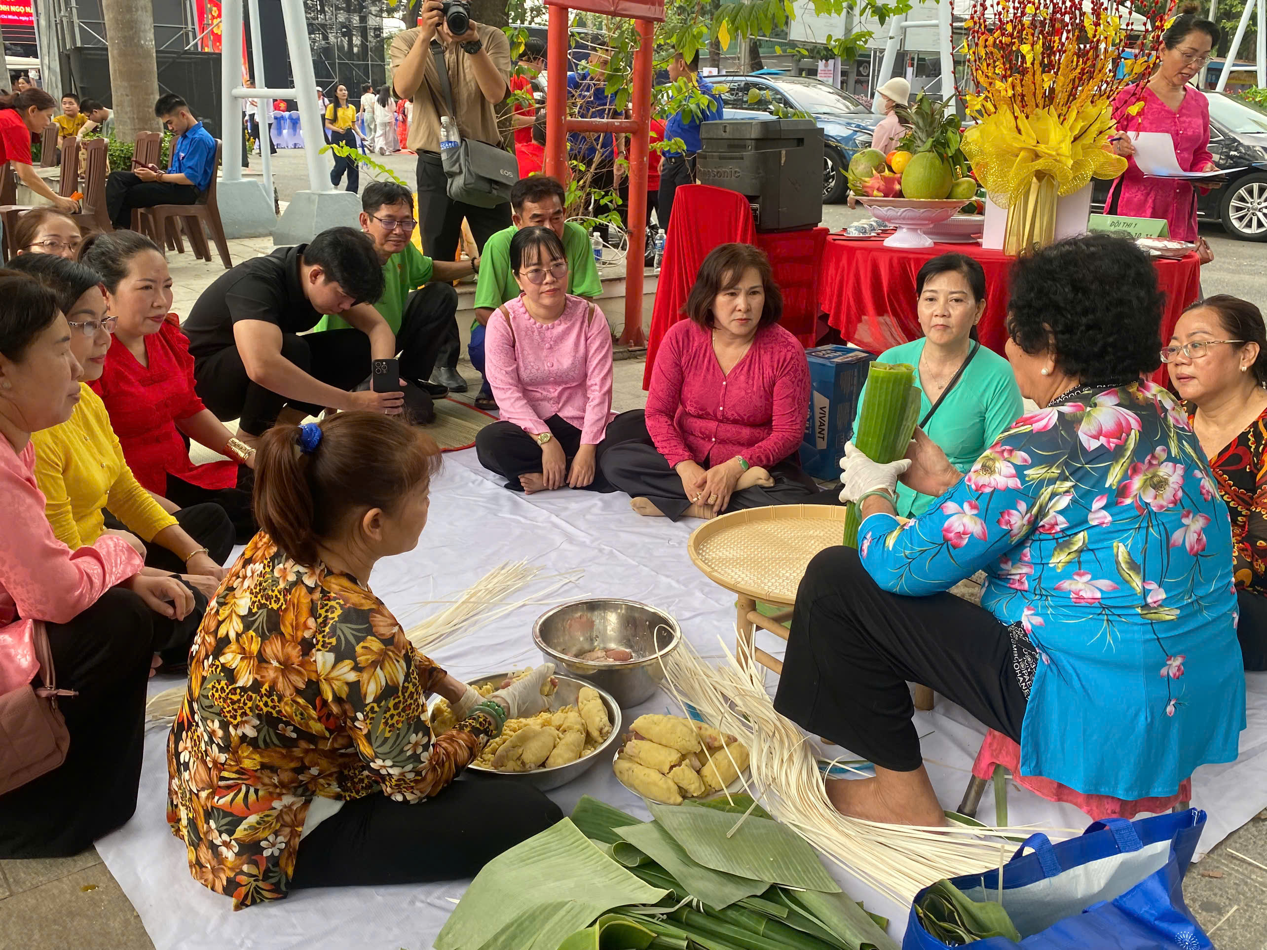 Các hội viên và người dân cùng nhau tham gia hội thi gói bánh chưng, bánh tét tại không gian "Góc phố ngày Tết".