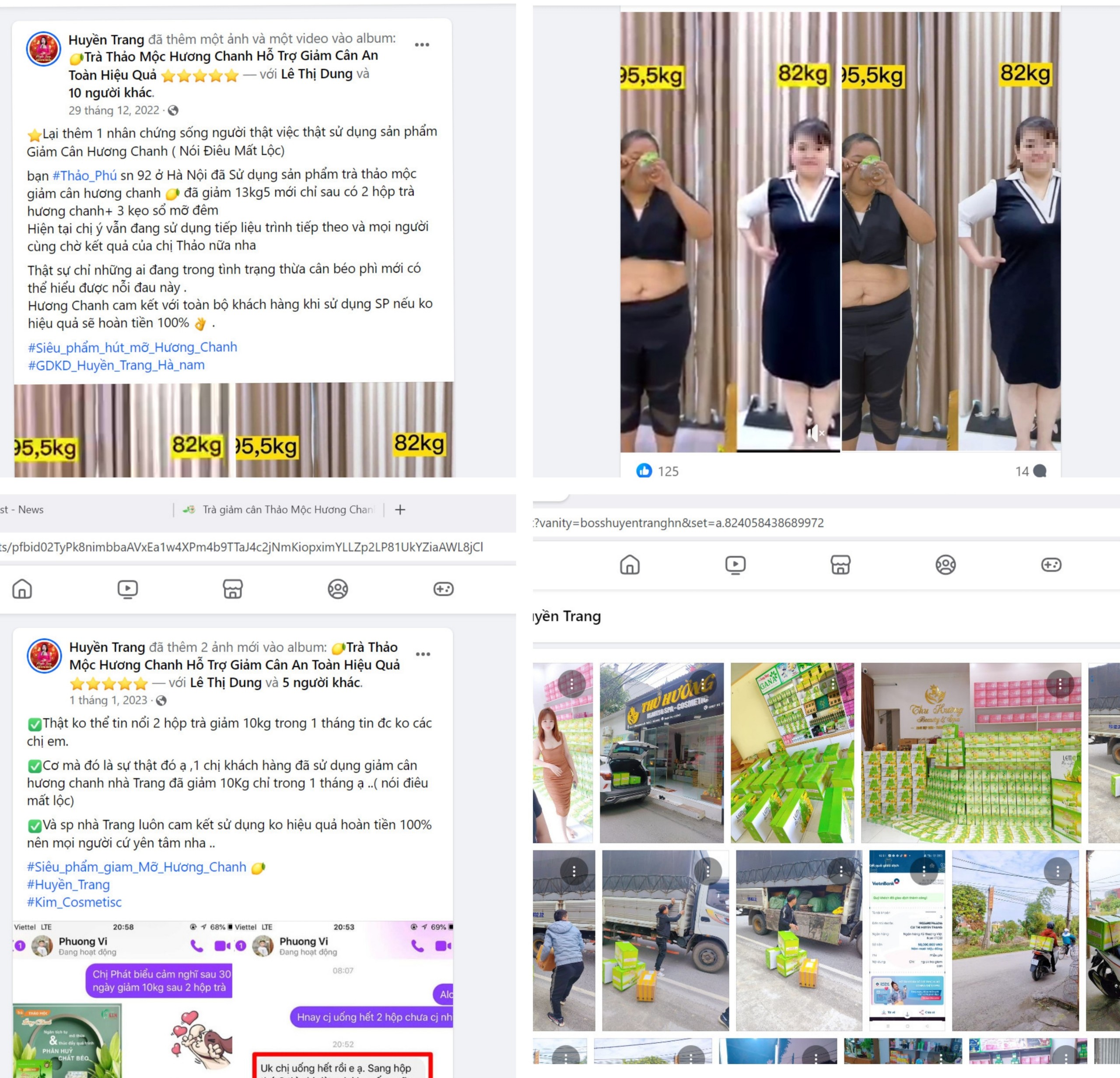 Trên facebook khác có tên “Huyền Trang”, giới thiệu là Phó tổng giám đốc Công ty Kim Cosmetisc đăng tải triết lý sống “thành công đến từ sự tử tế và chân thành”, nhưng lại liên tục đăng tải, quảng cáo cho sản phẩm TPBVSK có công dụng giảm cân như thuốc giảm cân. Cụ thể, nick name này đăng tải hình ảnh khách hàng (chưa được kiểm chứng) giới thiệu đã giảm 13,5kg sau khi sử dụng 2 hộp trà thảo mộc Hương Chanh và 3 kẹo sổ mỡ đêm. Thậm chí, có những khách hàng chỉ dùng 2 hộp Hương Chanh trong 1 tháng đã giảm 10kg... Để khách chi tiền mua sản phẩm, người này tiếp tục cam kết nếu sử dụng “siêu phẩm giảm mỡ Hương Chanh” không hiệu quả sẽ hoàn tiền 100%.
