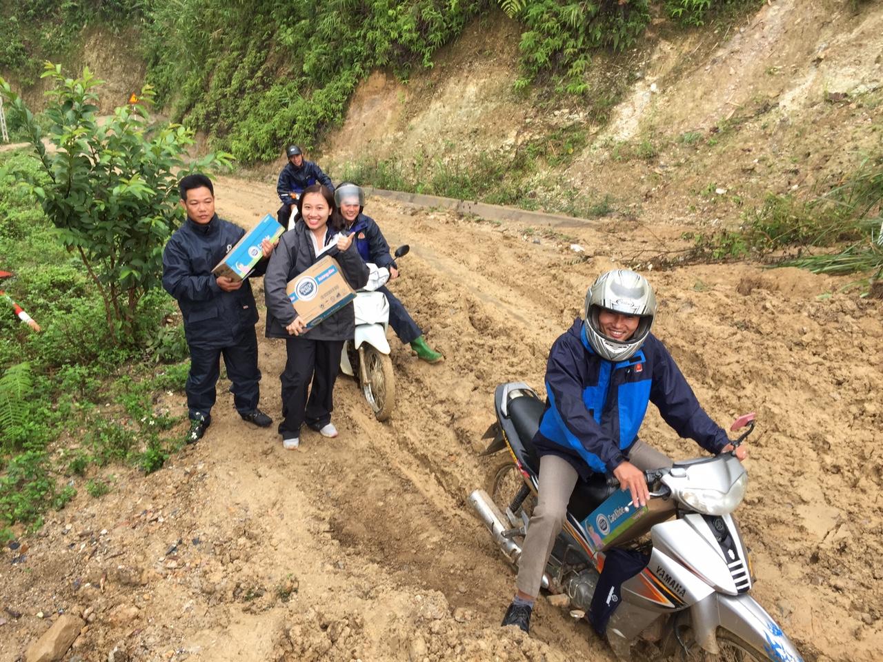 Từ thị trấn, đoàn công tác FrieslandCampina Việt Nam vận chuyển sữa đến trường bằng xe máy men theo những con đường sạt lở