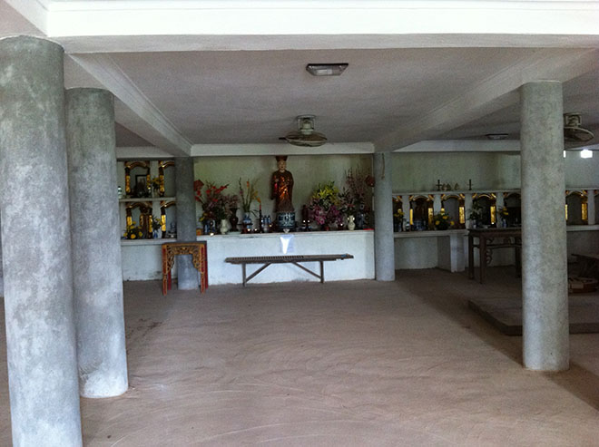 Kinh dị hơn, đường vào chùa phải chui qua một cái nhà sàn bằng bê tông cốt thép to như cái lô cốt, tầng phải chui qua của nó thấp lè tè, với những hàng cột thô kệch. Dưới gầm sàn đó, tượng gỗ phủ đầy vải vóc bẩn thỉu, các hộc tường xi măng xếp các ông bà tượng bóng nhoáng. Xe ô tô của nhà sư đỗ gần hàng tượng.