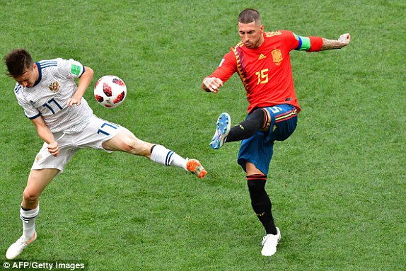 90+3' Smolov sút bóng từ cánh trái sượt đầu Cheryshev đi ra ngoài cầu môn Tây Ban Nha khá đáng tiếc