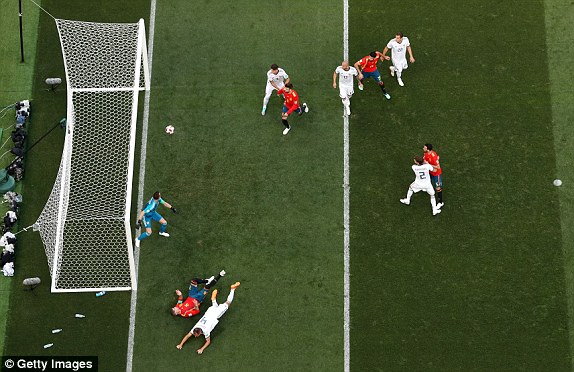 23' ĐT Nga được hưởng quả đá phạt. Samedov treo bóng đến bị trí của Dzyuba nhưng không làm khó được hàng thủ Tây Ban Nha