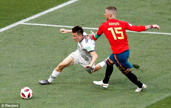 3. Koke sai lầm khi sút chính giữa và để Akinfeev đẩy được bóng. Golovin sút chìm ngay chính giữa nhưng vẫn chính xác. Nga dẫn 3-2.