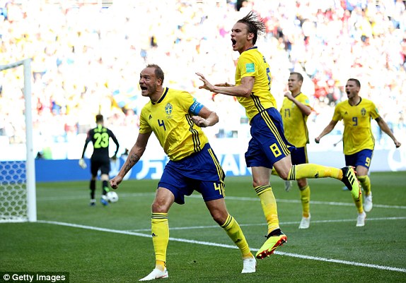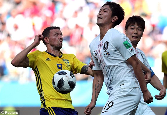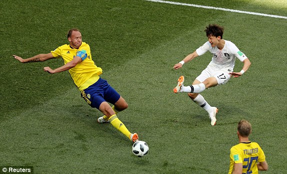 18' KHÔNG VÀO!!! Cú đánh gót của Marcus Berg tạo điều kiện cho Granqvist lẻn xuống. Rất may cho Hàn Quốc là trung vệ Young-Gwon bọc lót kịp thời.