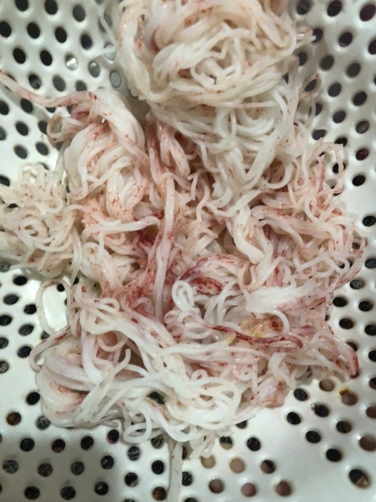 Đáng nói, đến sáng 7/7, số bún này tiếp tục đổi màu đậm hơn, nhiều sợi có màu đỏ rõ rệt. Khi ngâm bún vào nước, toàn bộ nước ngâm cũng chuyển sang màu hồng đậm.