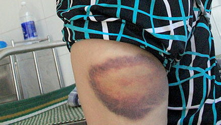 Đến chiều 2-12, vết bầm tím của bà Nguyễn Thị Khả (57 tuổi, trú tổ 89, phường Chính Gián, quận Thanh Khê, Đà Nẵng) vẫn không thuyên giảm dù đã 4 ngày trôi qua. Theo trình bày của bà Khả, hai vết bầm tím này là do một công an tên Phương đánh bà vào tối 27-11.