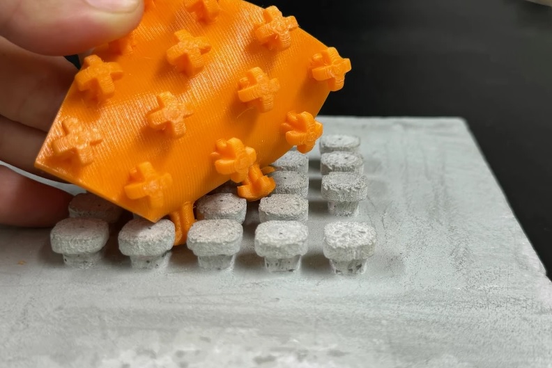 Trong phiên bản nguyên mẫu của hệ thống, các hàng móc bê tông đúc sẽ gắn vào hàng vòng in 3D được gắn vào các cạnh của tấm tường bên trong có thể thay thế.