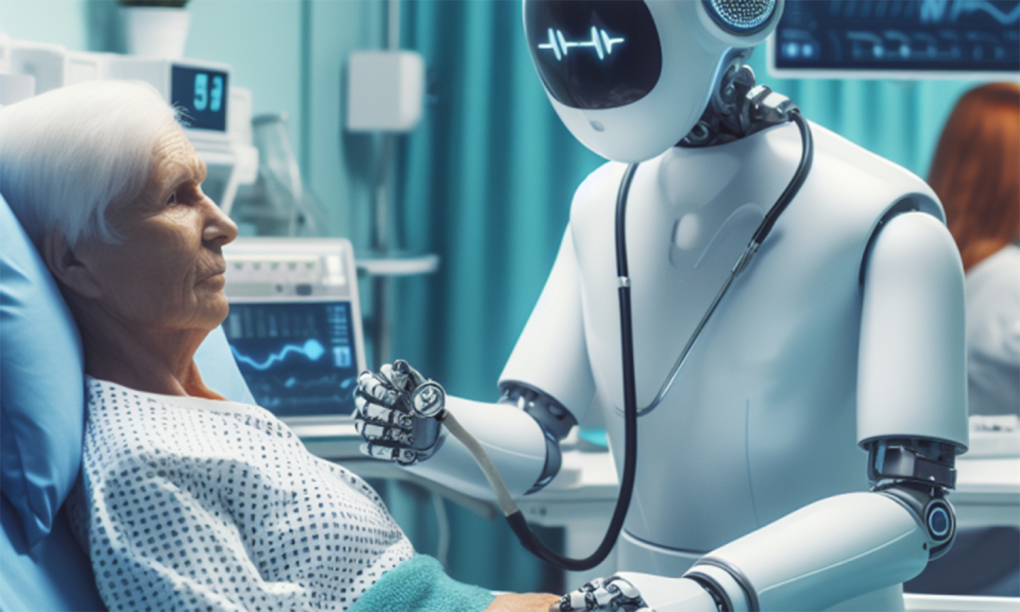 Minh họa robot thăm khám cho cụ già được tạo bởi AI. (Ảnh: Qazvinnews).
