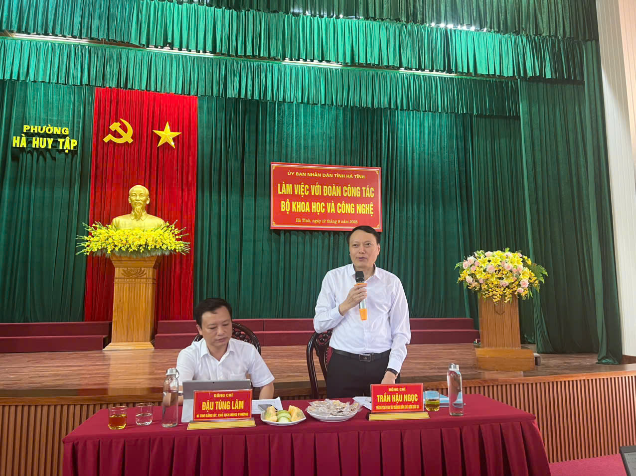 Theo đó, vào ngày 12/8/2025, đoàn công tác số 7 đã có buổi làm việc với UBND tỉnh Hà Tĩnh tại Trung tâm hành chính công tỉnh. Chương trình làm việc có sự góp mặt của đại diện lãnh đạo UBND tỉnh Hà Tĩnh, Sở Khoa học và Công nghệ cùng các cán bộ, đơn vị liên quan.