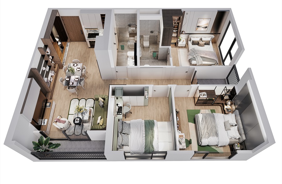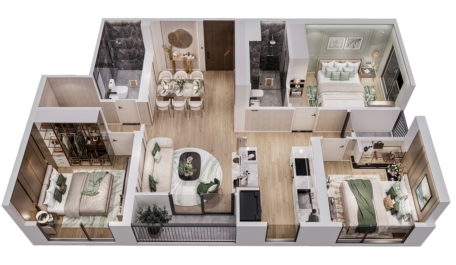 Layout căn hộ chú trọng công năng sử dụng, tận dụng tối đa diện tích tạo không gian sinh hoạt thuận tiện, luồng không khí tươi sạch tràn ngập mọi ngóc ngách.Với số lượng giới hạn, căn hộ 3 phòng ngủ The Victoria được lòng rất nhiều khách hàng vì sở hữu hàng loạt những lợi thế nổi bật. Không gian phòng khách, bếp và phòng ăn được thiết kế liền mạch vừa giúp nới rộng khu vực sinh hoạt chung, vừa giúp cả gia đình dễ dàng kết nối với nhau. 3 phòng ngủ được bố trí phù hợp với nhu cầu sử dụng của từng thế hệ trong gia đình. Bên cạnh đó, mỗi căn hộ 3 ngủ đều được bố trí 2 nhà vệ sinh riêng biệt mang đến sự thuận tiện cho các thành viên.