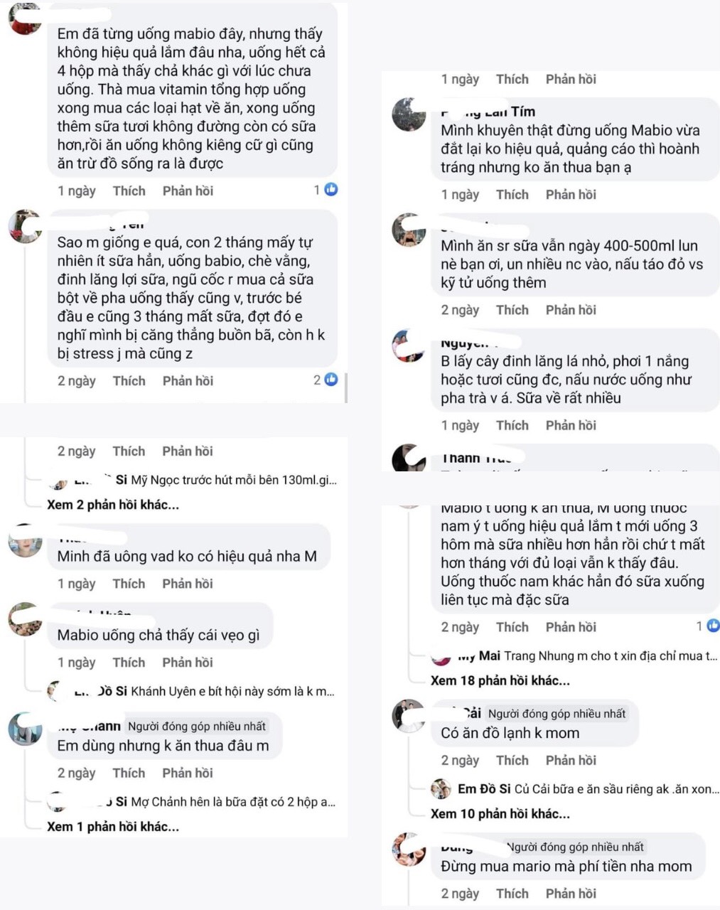 "Tôi đọc được quảng cáo về viên uống lợi sữa Mabio trên trang mạng xã hội: tập trung kích thích tuyến sữa; giúp mẹ lợi sữa; gọi sữa ồ ạt; hiệu quả gấp 50 lần các phương pháp thông thường (chè vằng, ngũ cốc, cốm...) cùng nhiều hình ảnh bác sĩ tư vấn nên nghĩ sản phẩm này hiệu quả và tốt cho sức khỏe và đã đặt mua. Tuy nhiên, sau khi sử dụng sản phẩm tôi không thấy dấu hiệu gì của việc sữa về tràn trề như trong quảng cáo mà tình trạng sữa sau sinh về khiêm tốn của tôi vẫn không được cải thiện", chị H.T thông tin với Chất lượng Việt Nam.
