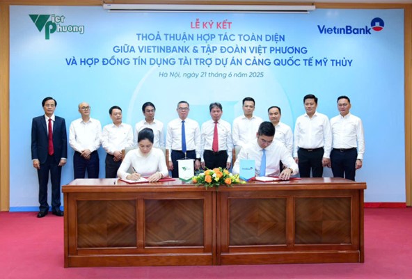 (VietQ.vn) - Ngày 21/6/2025, tại Hà Nội đã diễn ra Lễ ký kết hợp tác toàn diện giữa Ngân hàng TMCP Công Thương Việt Nam (VietinBank) và Công ty Cổ phần Tập đoàn Đầu tư Việt Phương (Tập đoàn Việt Phương). Cũng tại khuôn khổ chương trình đã diễn ra Lễ ký kết hợp đồng tín dụng tài trợ dự án Cảng Quốc tế Mỹ Thủy.