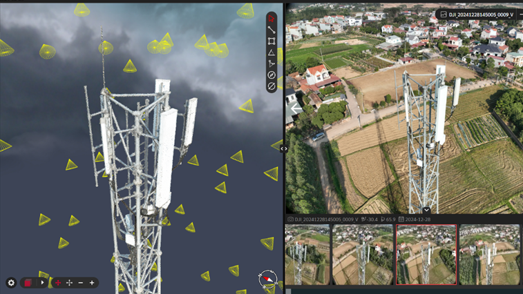 Digital Twin tự động dùng lại mô hình 3D chính xác của trạm BTS đưa trên dữ liệu hình ảnh thu được từ drone, giúp số hóa quy trình vận hành theo thời gian thực.